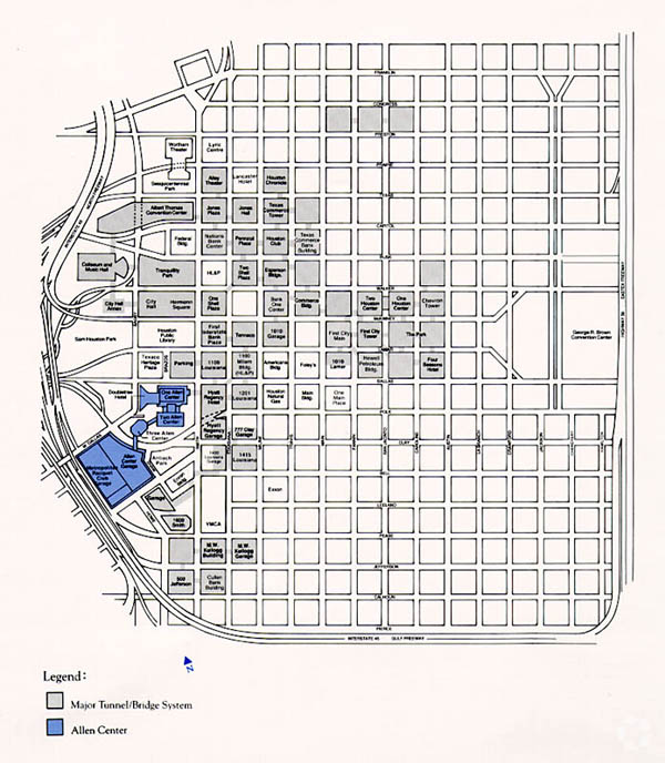 All buildings are connected by means of overhead walkways, permitting convenient climate-controlled access from all buildings to parking, health clubs, hotel, restaurants, retail shops and services. Located on downtown Houston’s tunnel system, the building provides direct covered connections from Allen Center to all major office buildings, banks, hotels, and restaurants in the Central business district.