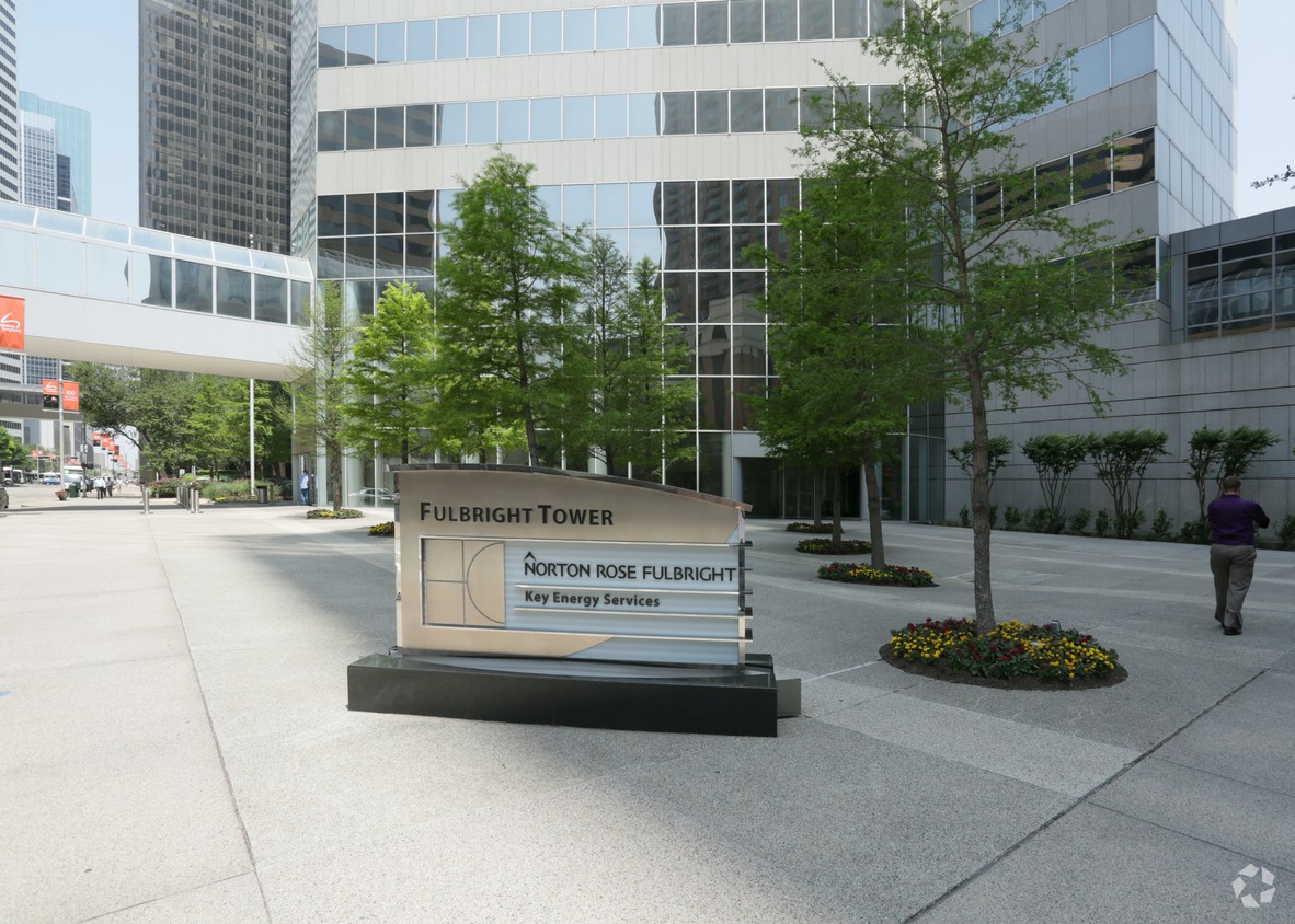 The striking bands of alternating Italian granite and silver reflective glass wrap Fulbright Tower in a beauty indicative of its thoughtful design and construction. Bounded by Walker, Caroline, and Austin streets, Fulbright Tower fronts on McKinney Street and connects directly with The Shops at Houston Center, 1 Houston Center, and a parking garage via enclosed, air-conditioned bridges. The building has been rotated 45 degrees on its site, thereby consolidating plaza and green space on the corners and allowing enhanced views to and from the building.