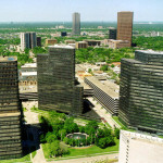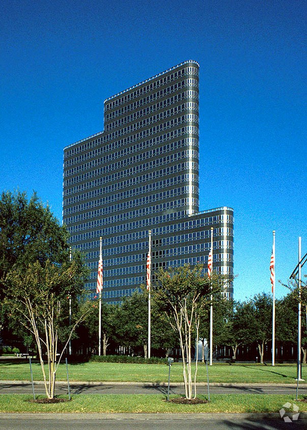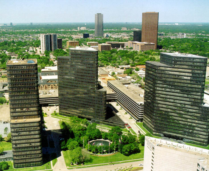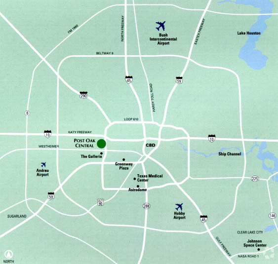 Post Oak Central offers a superior business environment strategically located in the West Loop/Galleria sub-market. The Galleria Complex, just two blocks from the service core of Post Oak, including Neiman Marcus, Galleria Bank, the 404-room Houston Oaks Hotel, the University Club, a private tennis and athletic club, and numerous top quality shops and restaurants. The Galleria helps top combine pleasures of leisure time with all the conveniences of the CBD. Other prestigious fashion names include Macy’s, Sakowitz, Saks Fifth Avenue, and Lord & Taylor. Designed by Philip Johnson and John Burgee of New York and S.I. Morris Associates of Houston (office interior by Atlantis Corporation and interior design by Wilds, Canon of Houston), it is an important architectural statement. Wide and narrow alternating bands of silver reflective glass and charcoal anodized aluminum made continuous by curving corners creates the prominent architectural profile of Post Oak Central. Floors 12-21 of the office tower are recessed 30′ from the first 11 floors and the top 3 levels of the building are set back 60′, creating a unique silhouette. Post Oak’s strategic location places tenants within easy access of a complete system of radial and lateral freeways and major streets. The building is located on a six-lane thoroughfare which feeds into even larger traffic arteries. The Southwest Freeway (US-59), the South Loop, the Katy Freeway (I-10), and the North Loop, are just a matter of minutes from Post Oak Central.